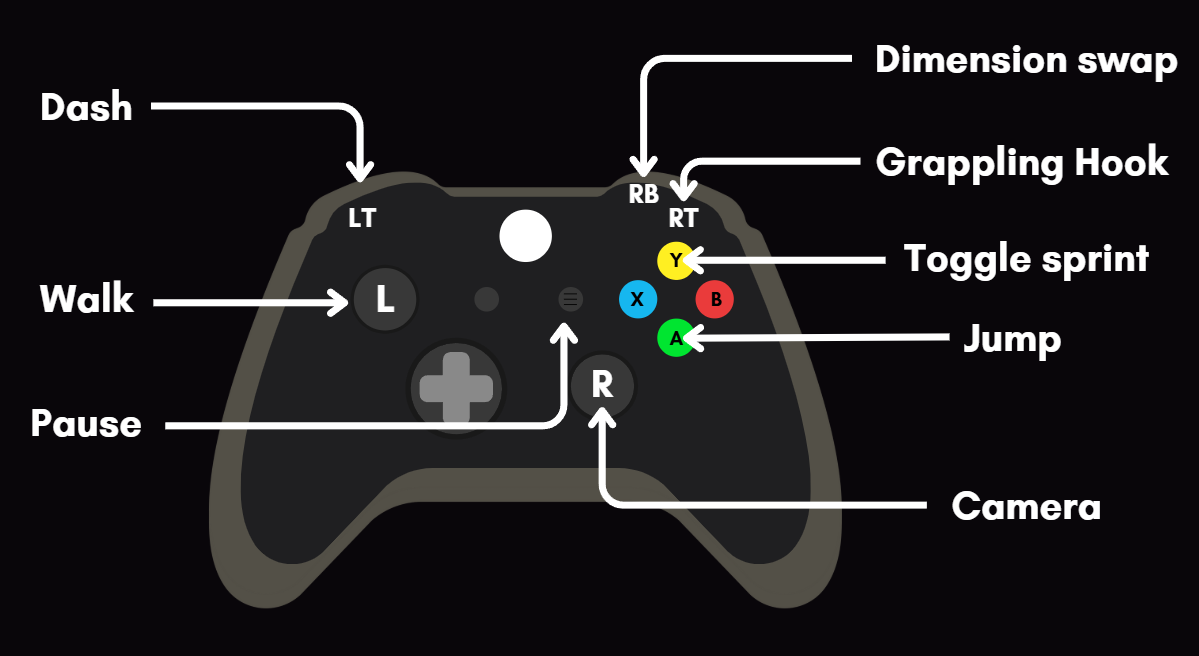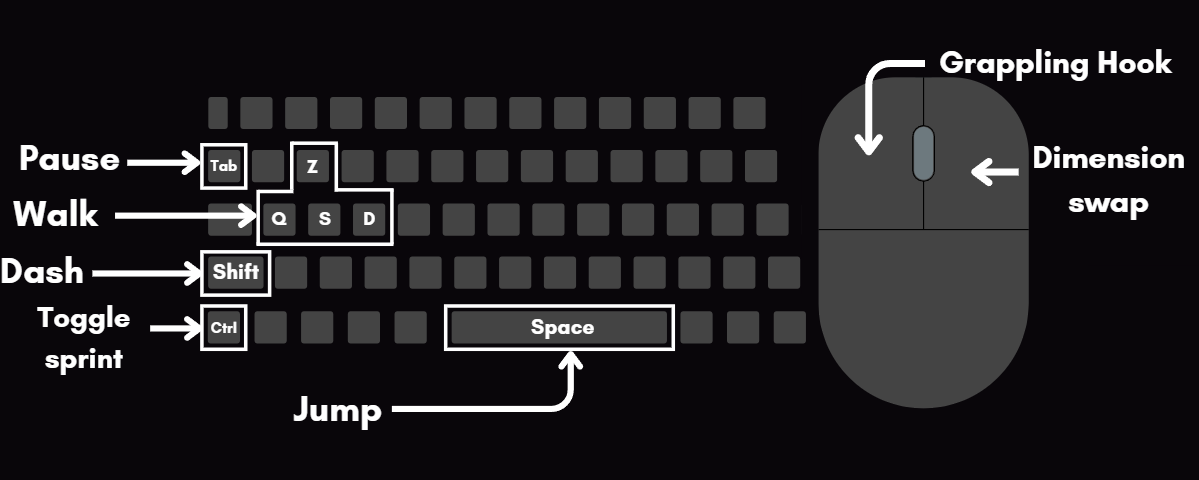 Run, jump, dash, swap dimensions and grapple through two cities to navigate through a fast-paced, 3-dimensional world !